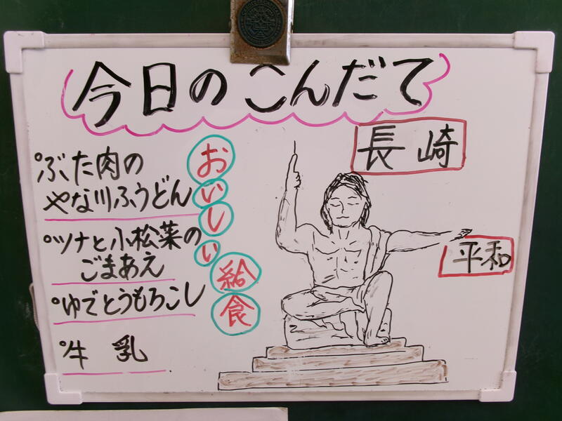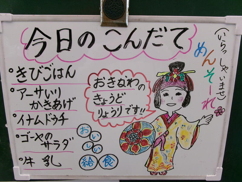 今日は、この日にちなんで、沖縄の郷土料理が給食に登場しました。「アーサ入りかき揚げ」は、あおさと野菜をカリッとかき揚げに、「イナムドゥチ」は、豚肉、こんにゃく、人参、しいたけなどの具材がたくさん入っていていました。「ゴーヤのサラダ」は、マヨネーズで味付けしてあり、とても食べやすかったです。給食を通して、自分たちの住んでいる地域以外の、様々な出来事を知ることができます。勉強になります。今日も美味しい給食に感謝・感謝です。