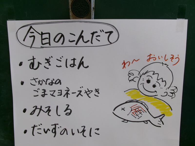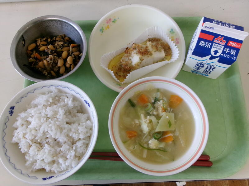 今日の給食は、【麦ごはん、牛乳、魚のごまマヨ焼き、野菜の味噌汁、大豆のいそに】です。