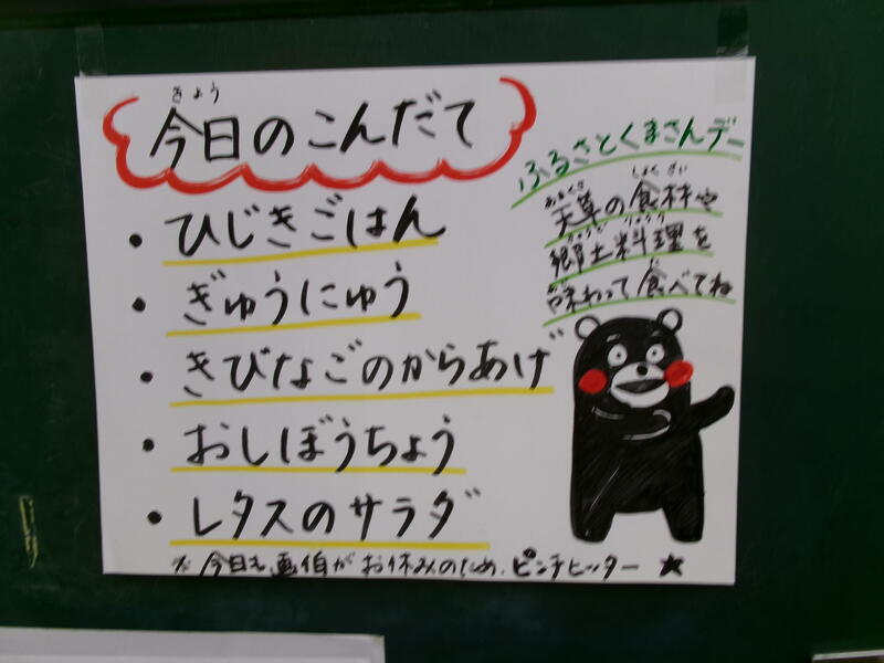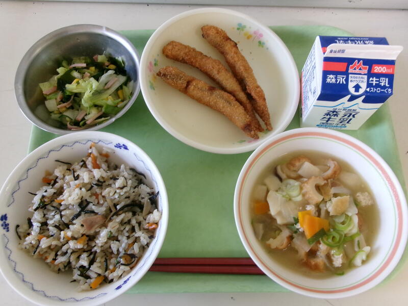 今日の給食は、【ひじきごはん、牛乳、きびなごのからあげ、おしぼうちょう、レタスのサラダ】です。