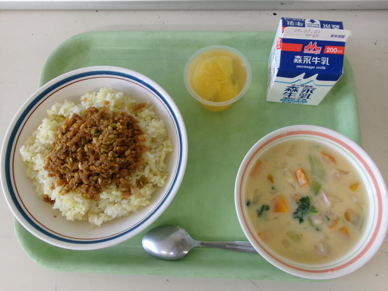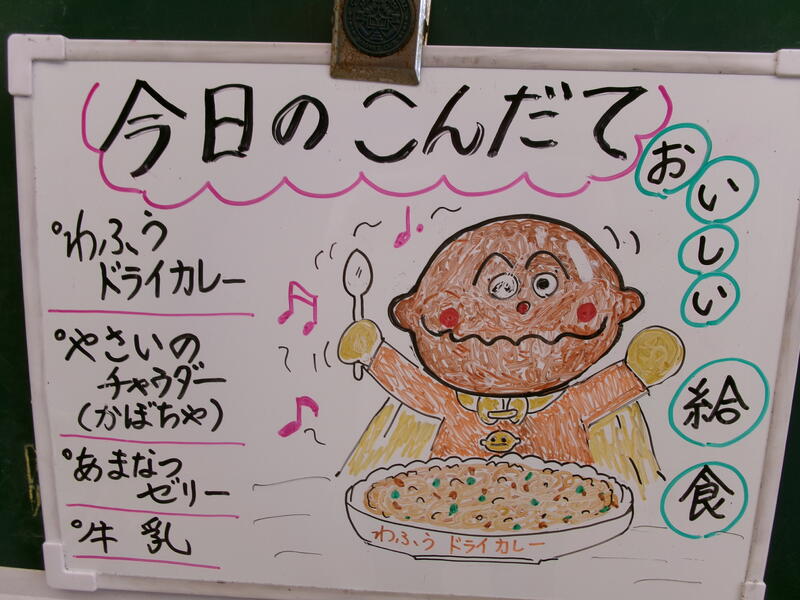 今日の給食は、【和風ドライカレー、牛乳、やさいのチャウダー、あまなつゼリー】です。