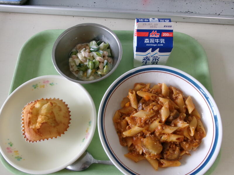 今日の給食は【米粉マフィン、牛乳、なすとペンネのトマトソース、ビーンズサラダ】です。