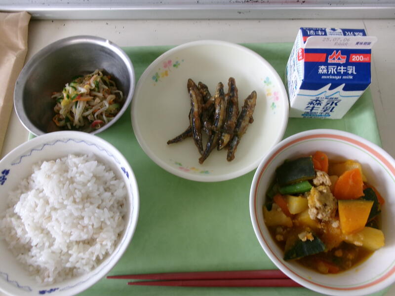 今日の給食は【麦ごはん、牛乳、きびなごの香味ソース、かぼちゃのそぼろ煮、きゅうりともやしの酢の物】です。かぼちゃは、ビタミンや食物繊維が豊富で免疫力向上、便秘改善に役立つそうですね。今日も、学校は、とても蒸し暑かったです。夏野菜をしっかり食べて、夏を乗り切りたいですね。今日の給食もとても美味しかったです。