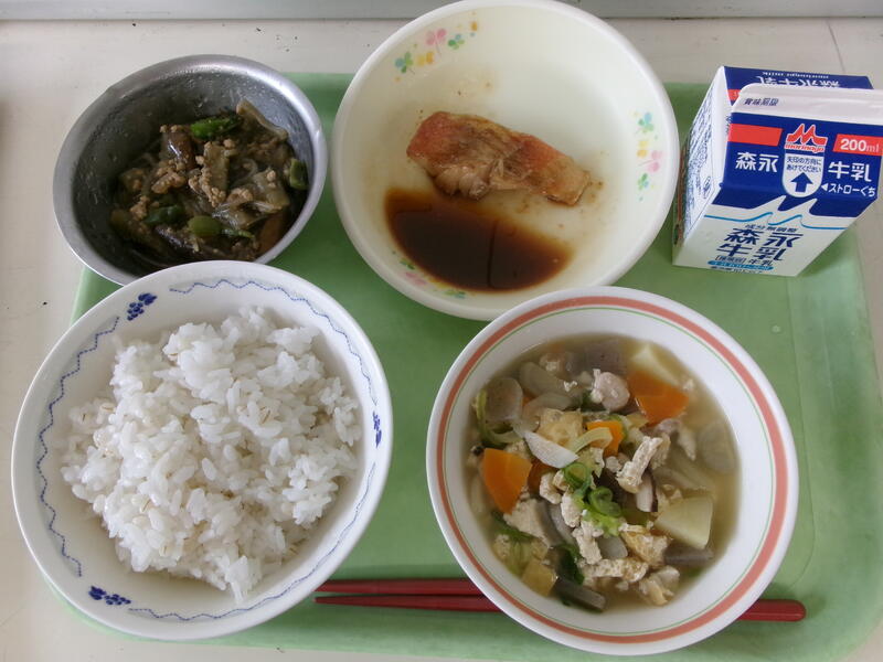 今日の給食は【麦ごはん、牛乳、魚の煮つけ、けんちん汁、なすのみそ炒め】でした。