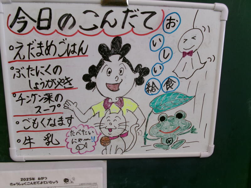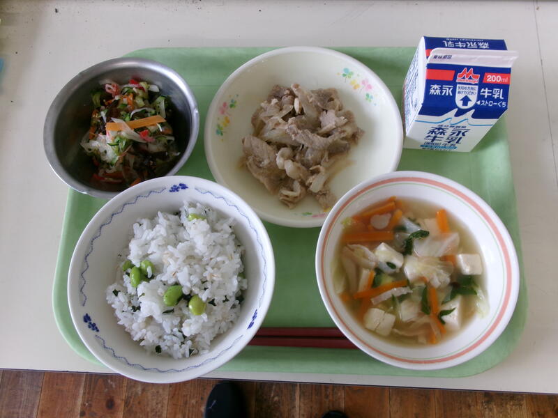 今日の給食は【枝豆ごはん、牛乳、豚肉のしょうが焼き、チンゲン菜のスープ、ごもくなます】でした。