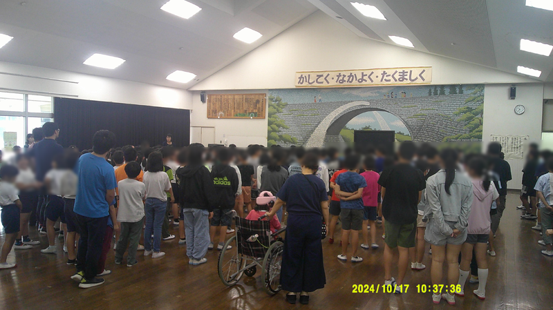 最後は「今月の歌」を全員で合唱して 締めくくりました。私は、日ごろから歌声の小さい学年のエリアをクマのようにウロウロしながら、聴き耳を立ててノッシノッシと歩きました(笑笑)。その様子をみている子どもたちの顔は笑っています。そして私が立ち止まると少し声が大きくなります。「遊び心」をもちながらも檄を飛ばしています。もっと弾けようぜー♪楽しく歌おうぜー(^^♪