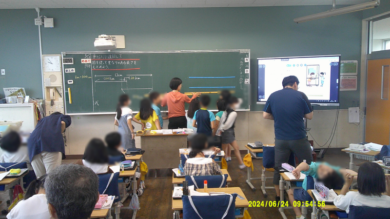 今日の課題を提示。まずは個人思考の時間。しばらくして「ヒントがほしい」という子を前に集めて、先生が実際に物差しを使って解説を加えています。