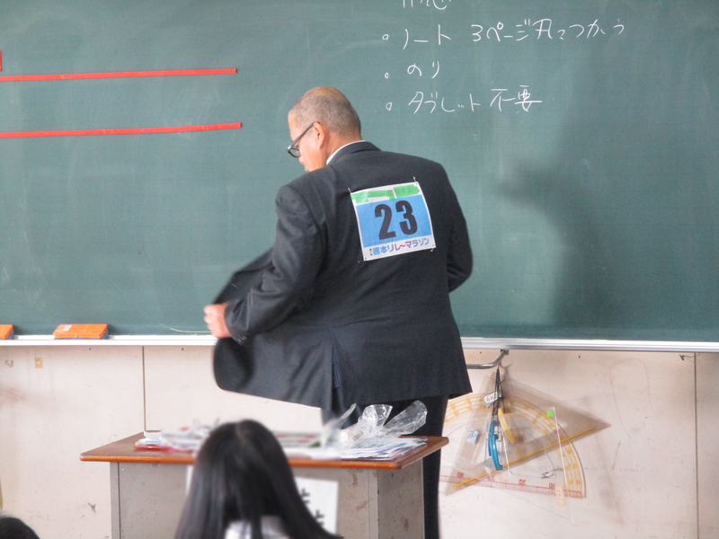 実は、11/3に出場した熊本リレーマラソンの選手用ゼッケンを背中につけていたのです。