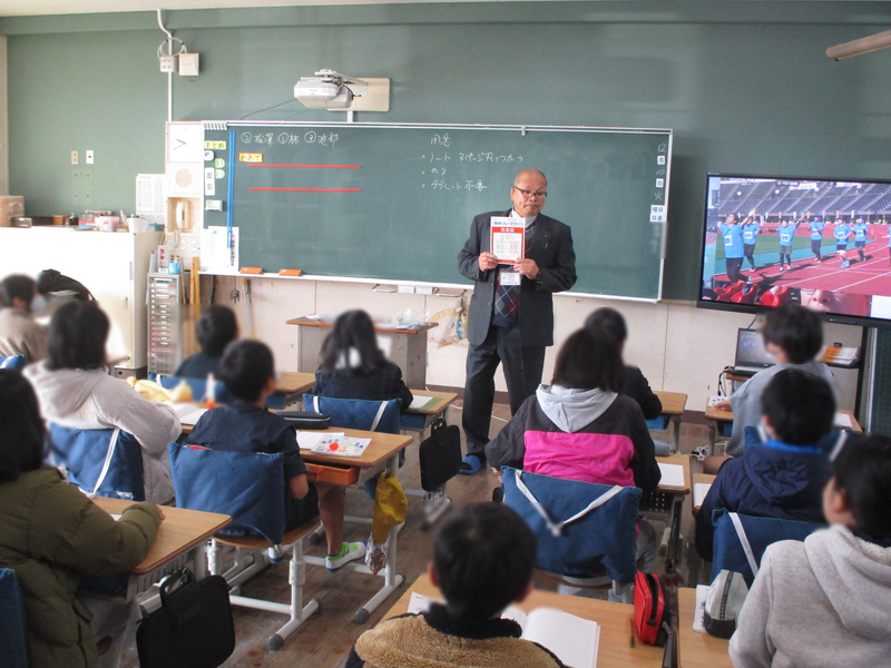 担任M先生と、教頭先生と、私の3人でマラソン大会時に早かった順番を当てさせました。ここで、「同じ距離で走ったときに短いタイムで走った方が速い」ことをおさえました。ちなみにリレーマラソンでは1人で最低周回コース1周(2km)走ることが義務付けられています。校長が手にしているのは大会当日の矢部小ジョッキングクラブの記録証。たまたま本日届いていました。