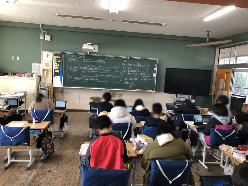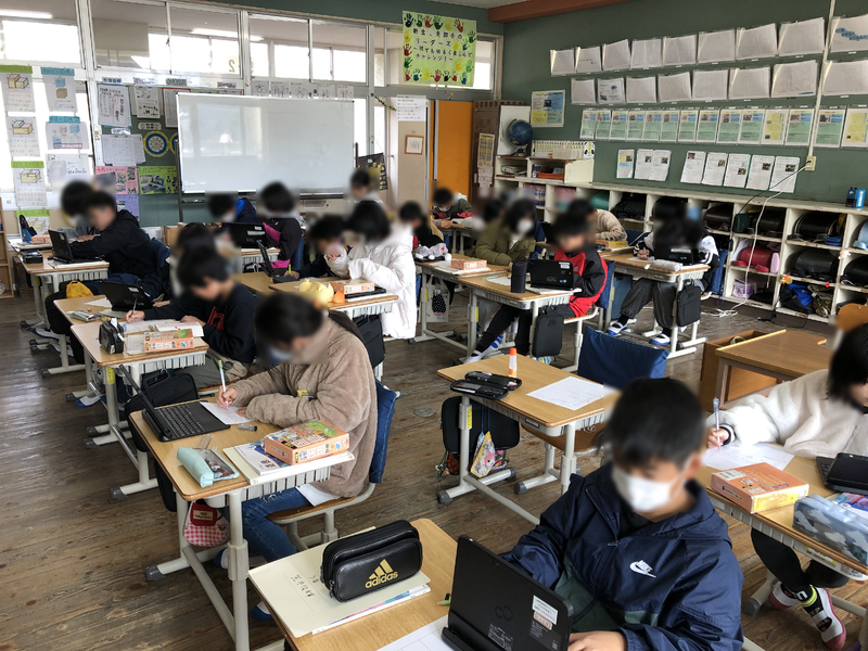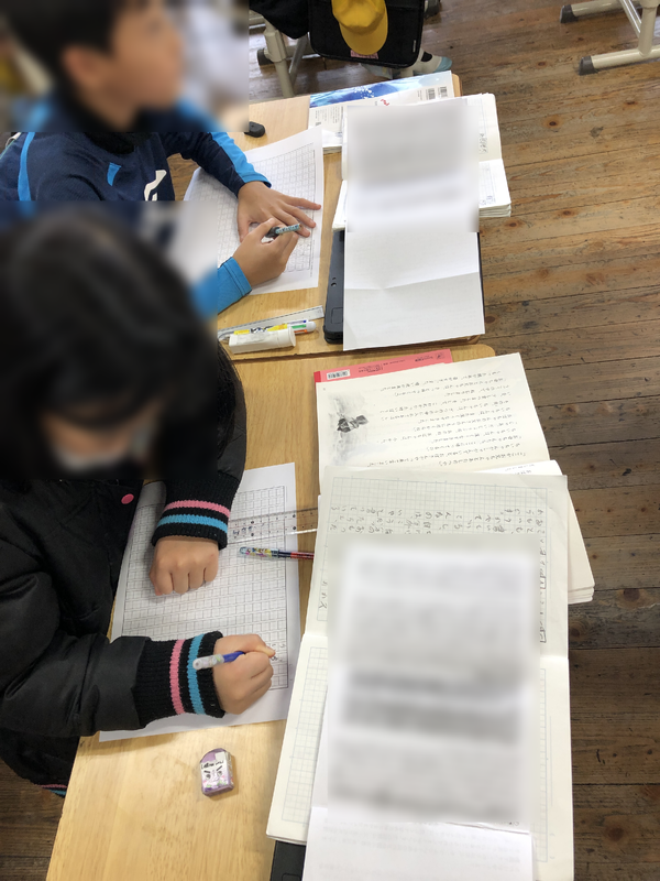 教室に入ると子どもたちは黙々と(正確には1名が「〇〇くん声大きい」と指導を受けてましたが・・・苦笑)作文に取り組んでいました。2年生で原稿用紙の使い方を学んでいますが見本を元に再確認しながら書いています。