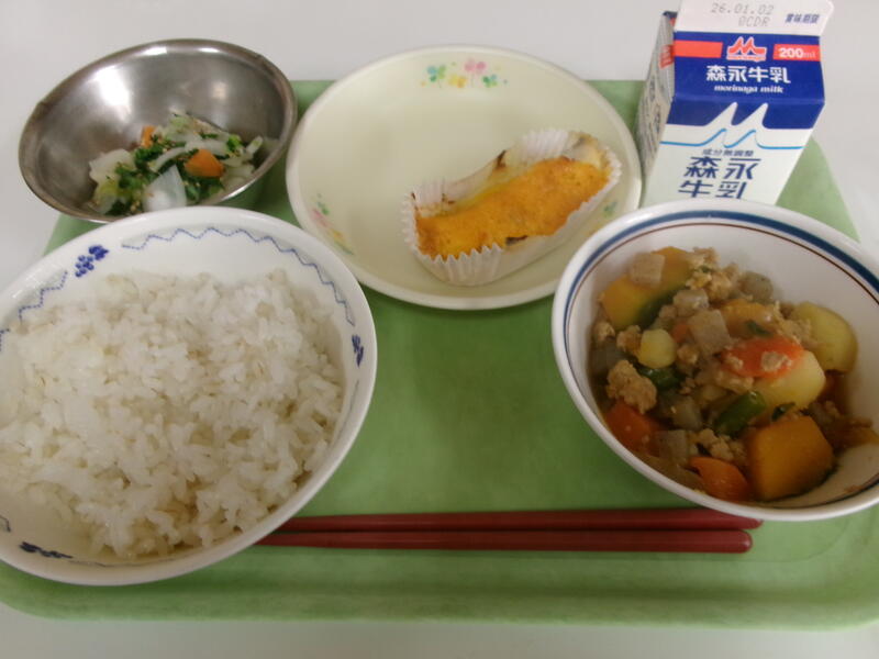 鶏肉がたっぷり入ったカレーと、こくのある豆とかぼちゃのサラダの相性がバッチリで、とても美味しい給食でした。今学期の給食も、あと7回です。今週も美味しい給食に感謝・感謝です!