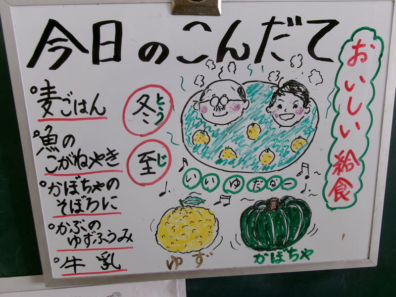今日は、冬至ですね。冬至には、かぼちゃなどを食べたり、ゆず湯に入ったりする風習がありますよね。今日は、かぼちゃとゆずを使った料理が出てきました。美味しかっただけではなく、色彩もとてもきれいでした。2学期の給食も、明日で終わりです。今日も美味しい栄養たっぷりの給食を感謝していただきました。