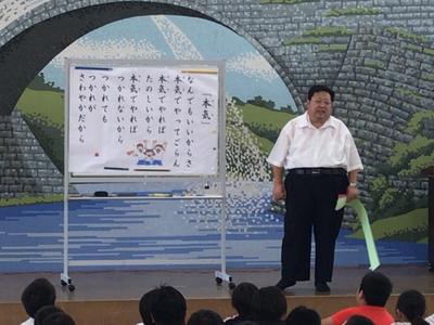 9月3日(火)、9月の全校集会が行われました。校長先生は、「本気」という詩を紹介し、運動会になぞらえて本気でものごとに向き合う心地よさについて話をされました。
