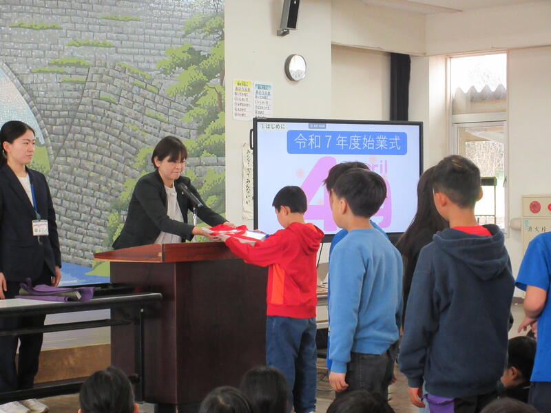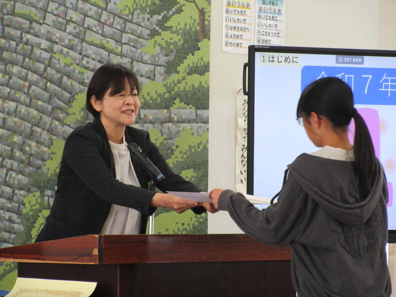 修了式では、まず、終了証(通知表)を渡しました。各クラスの代表が終了証を受け取りました。