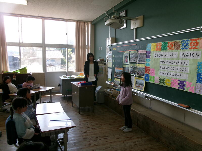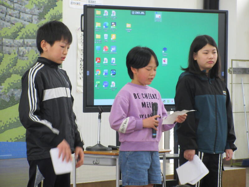 その後、学級の代表が1年間を振り返って、発表をしました。発表では、1年間頑張ったこと、心に残ったこと、次の学年で頑張りたいことを発表してくれましたが、高学年では「6年生になったら、下級生を支えて頑張りたい」「5年生になったら、6年生と一緒に学校のために頑張りたい」などと意欲のある発表もありました。