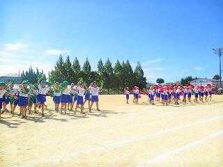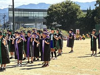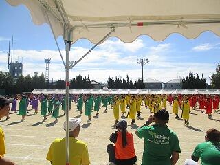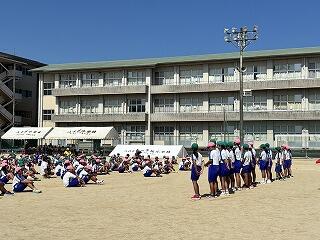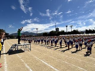 素晴らしい天気でとてもいい運動会でした。最後は双葉会会長の音頭による「やちわの『わ』」を全校で行いました。