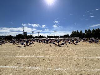 音楽に合わせてグラウンドを走り、学年の「お手本係」のペースに合わせて楽しく体を動かしています。