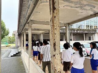 フィールドワークです。「さるくガイド」の皆さんから説明を受けながら、今も残る原子爆弾の爪痕を見学しました。