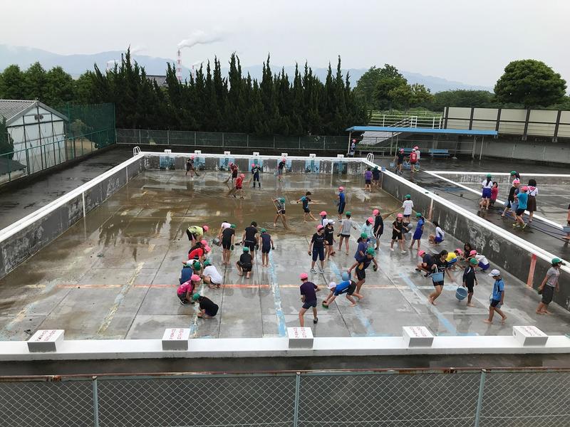 今日は朝から過ごしやすい天気でしたが、午後から小雨となりました。昼休みは体育館や教室で過ごす子どもたちでした。そんな中、6年生はプール掃除を頑張ってしてくれました。1年間のたまった汚れをしっかりと落としてくれました。ありがとうございました。