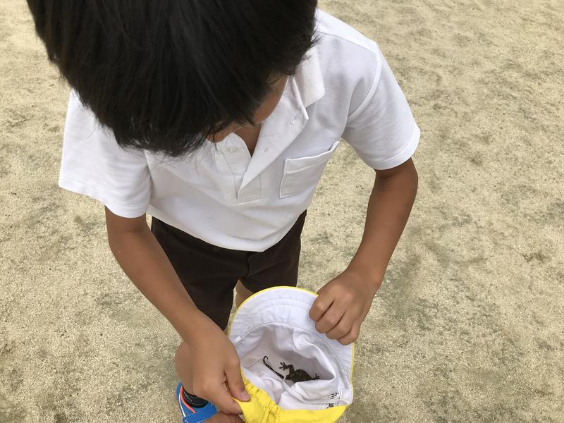 運動場の隅で虫取りに夢中になる子どもたちです。