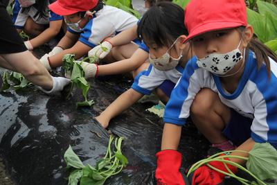 6月4日(木)、地域の方々のご協力を得て、2年生児童が地域の畑に出向き、「サツマイモの苗植え」を行いました。