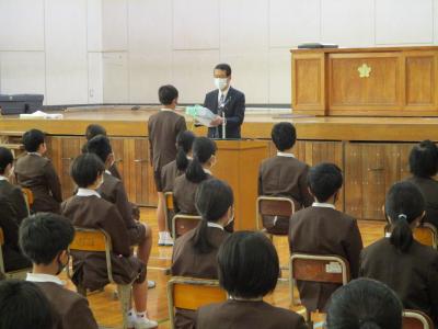 全校児童を代表して、5・6年生の運営委員からダニエル先生への寄せ書きを渡し、これまでのお礼としました。