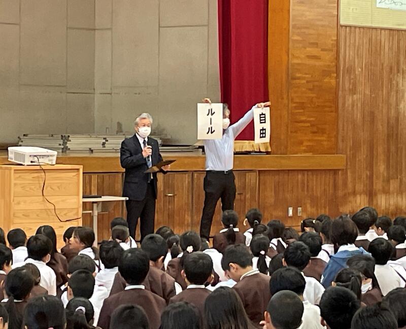 校長先生からは、「自由」とは自分勝手にすることではなく、「ルール」をしっかり守った上のものであること、みんなが「ルール」を守った中で「自由」にすることが、楽しくて安心安全な生活につながるというお話がありました。