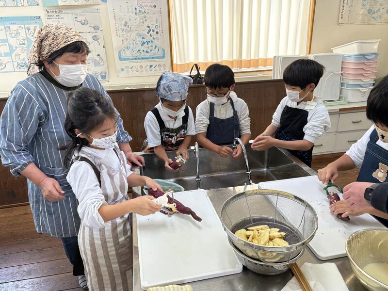 子どもたちは芋の皮むきや材料混ぜなどの作業を行いました。調理後の後片付けもみんなでがんばりました。