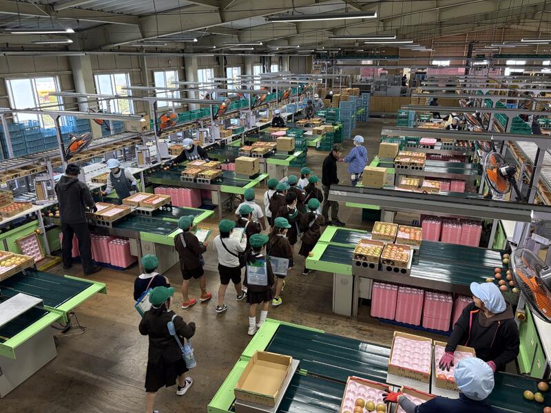 「JAやつしろ中央トマト選果場」では、1日約50万玉のトマトが箱詰めされる様子などを見学しました。