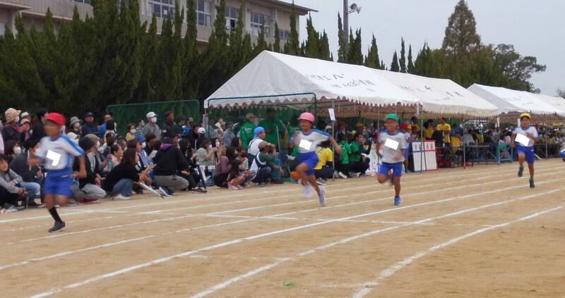 <3年徒走「ゴールめざしてゴーゴーゴー!」> <6年徒走「100m走」>