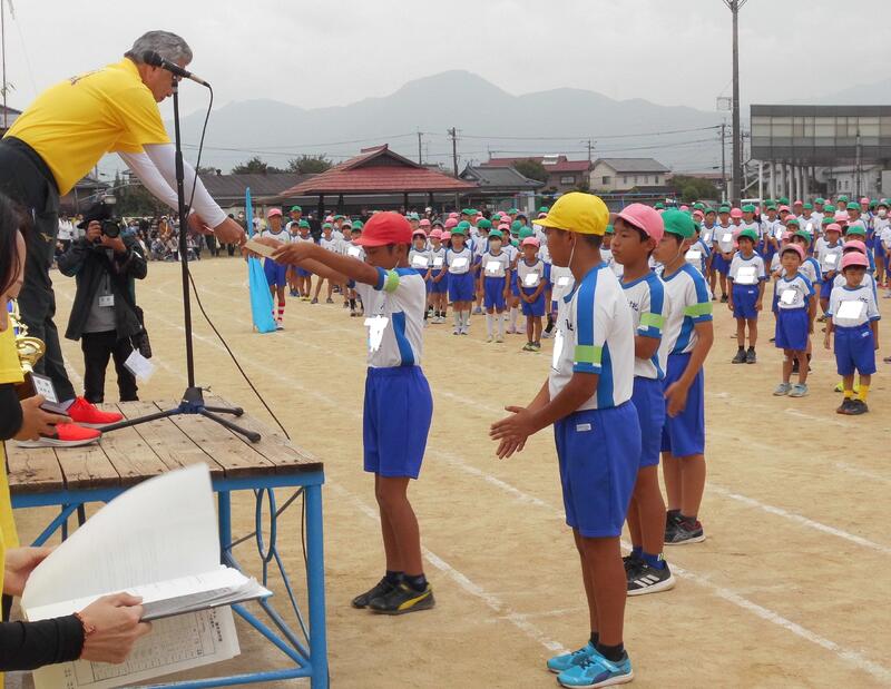 成績発表(6年生代表) 表彰(優勝:赤団) 表彰(準優勝:青団)