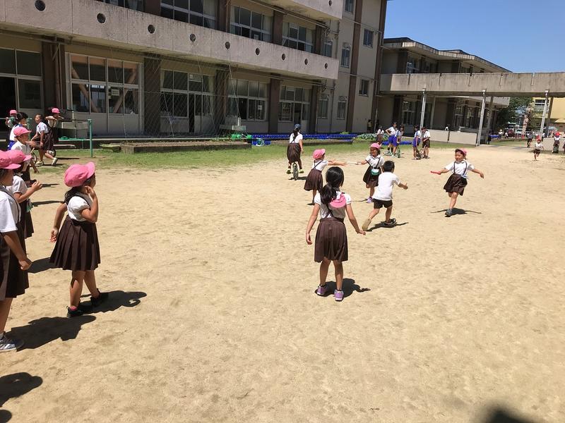 中庭にて、折り返しリレーです。大声援の応援でした。