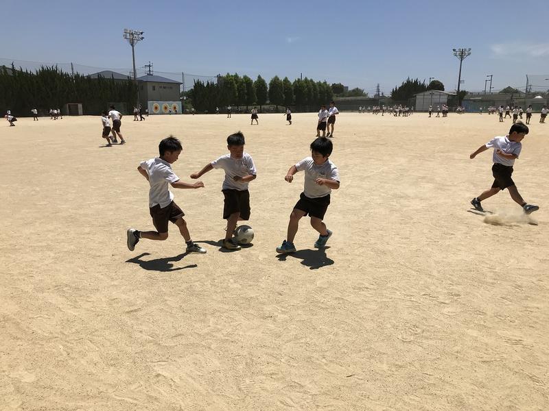 先日の雨天から一転し、本日は晴天に恵まれ、子どもたちにとって絶好の遊び日和です。昼休みの運動場や中庭は大賑わいでした。