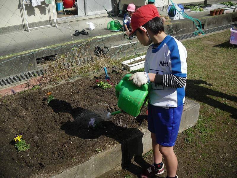 先生が「一つの花の上で10数えて、しっかり水をかけるんだよ。」を言われました。そうしたら、何度も水を汲みに行って、すべての花に十分水をかけることができました。これからも、毎日水かけをがんばってくれることでしょう。
