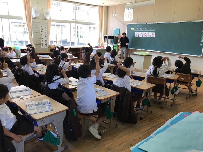 1年3組での算数の授業です。単元は「いくつといくつ」でした。今まで学習した数のまとまりを元気にテンポ良く答える1年生でした。