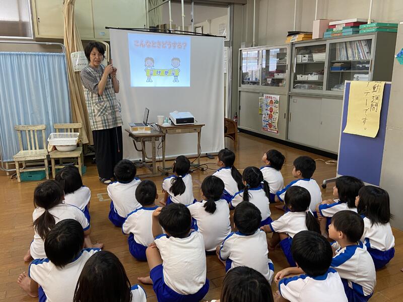 今回は、養護教諭から1・2年生には、けがの手当ての仕方について