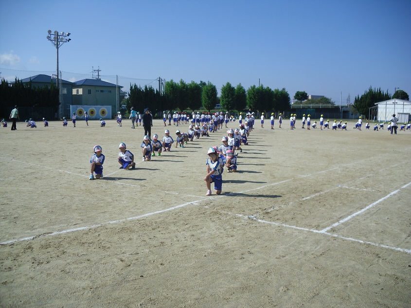 天候に恵まれて、今日は運動場で行いました。3連休明けで体調面を心配しましたが、具合が悪くなる子どももほとんどおらず、きびきびとした態度で練習に臨みました。