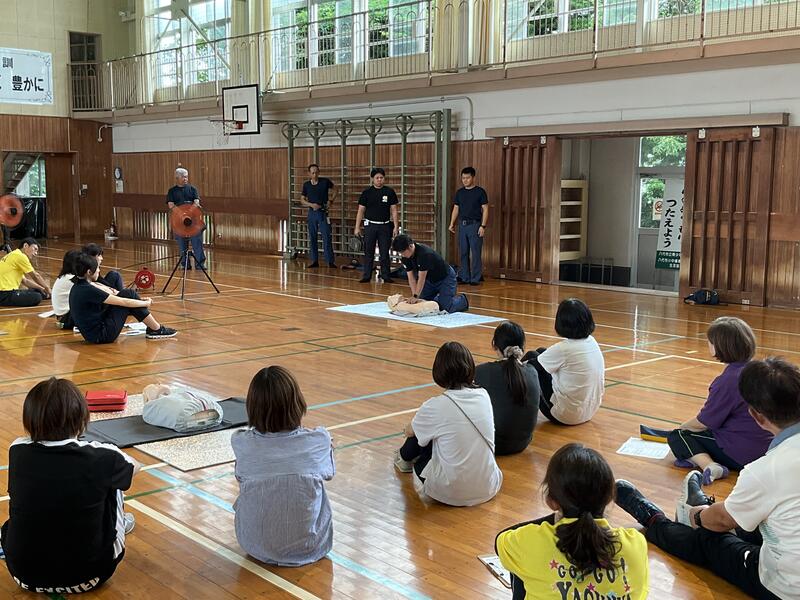 今回も八代消防署の方に来ていただき、胸骨圧迫の仕方、AEDの使い方等を教えていただきました。