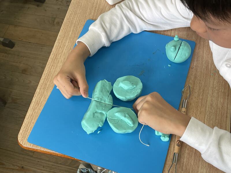 下の写真は、3年生の図工の学習の様子です。用具を使ってねん土を切ったり、掻き出したり、