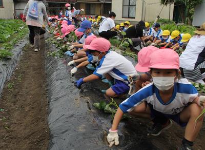 6月4日(木)、地域の方々のご協力を得て、2年生児童が地域の畑に出向き、「サツマイモの苗植え」を行いました。