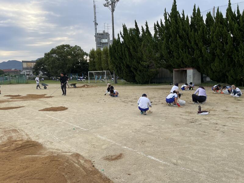 今回は、運動場、中庭、体育館周りの草取り、運動場の土入れとならし、溝掃除、トイレの清掃など