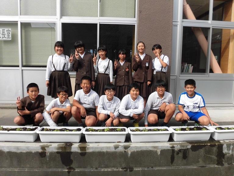 プランター10個に植え終えた栽培委員会のみなさん。ありがとうございました。