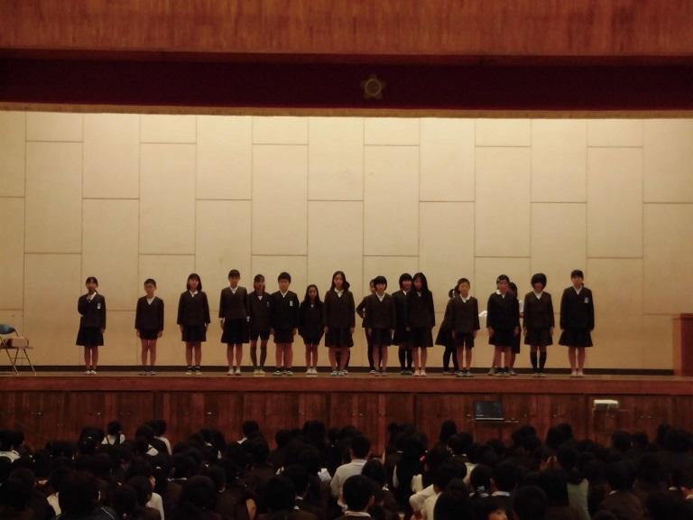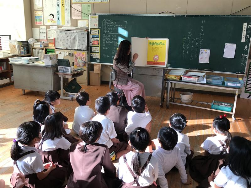 全児童の前で読み聞かせをしました。