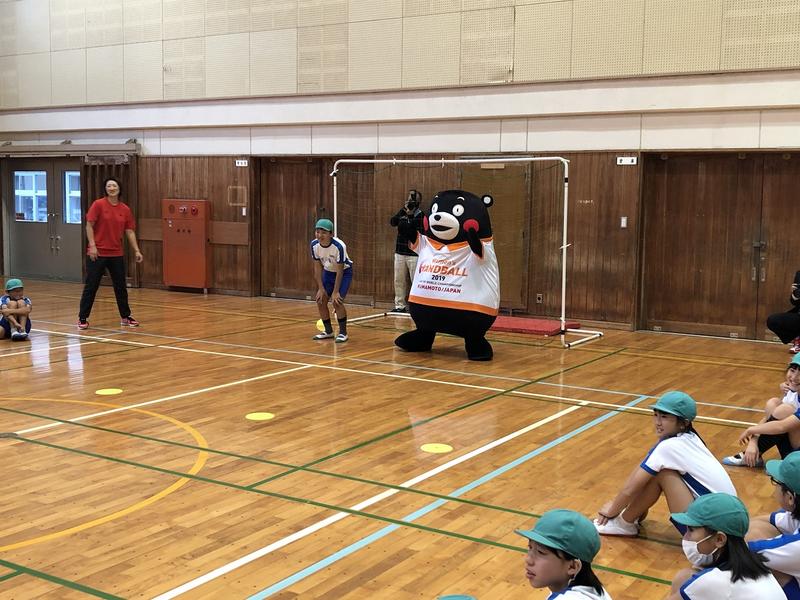 本日は、6年生のハンドボール教室がありました。熊本市出身で元日本代表選手の岩本真典さん及び熊本県ハンドボール協会の方々においでいただき、ハンドボールの魅力と楽しさを伝えていただきました。くまモンも来校し、子どもたちと一緒に練習に参加するなど楽しく学習することができました。