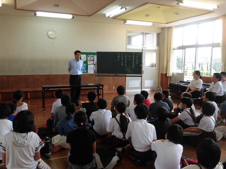 1学期を振り返っての話をしていただきました。4月に1年生の入学、5月は2年生の校区探検・3年生の交通教室・5年生の集団宿泊、6月は6年生の修学旅行・4年生の社会科見学・童話発表会などすべての児童への頑張りを紹介して下さいました。