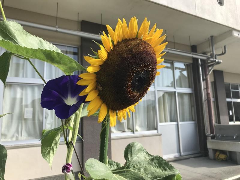 ひまわりルーム前に植えた、ひまわりがようやく咲きました。夏本番が近づいてきました。