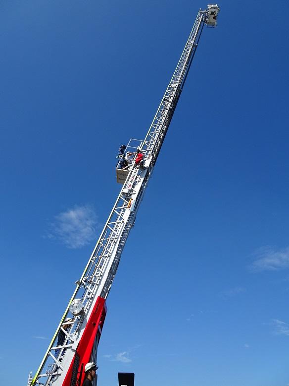 はしご車搭乗の準備です。ヘルメットやベルトをしっかりと着けます。