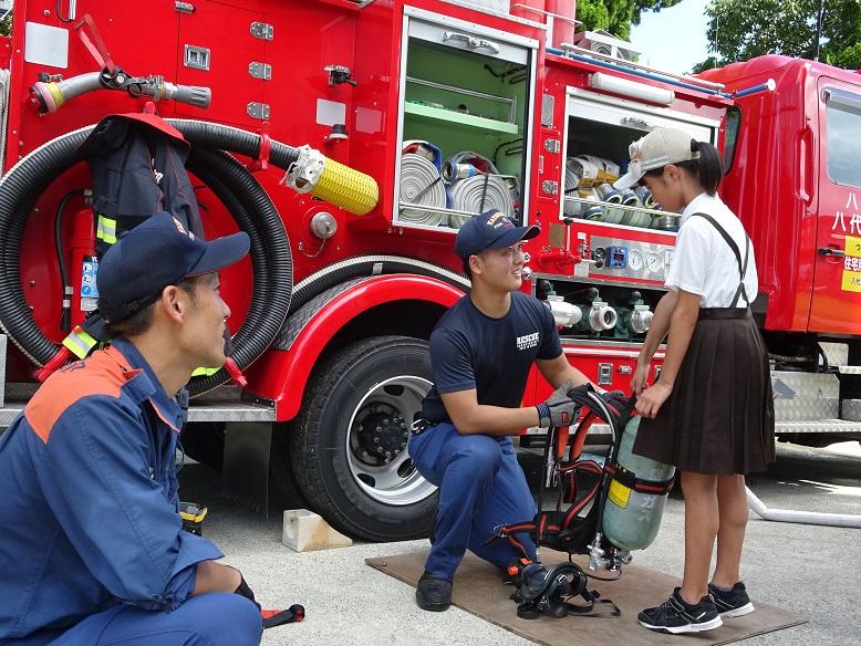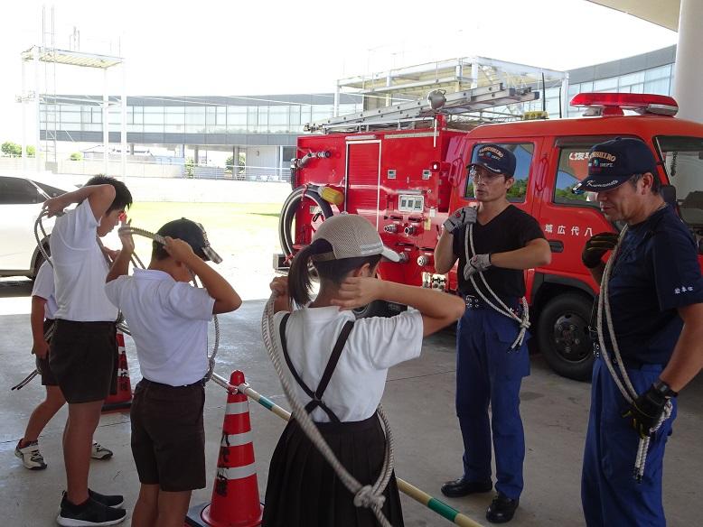 本日、本校消防クラブの子どもたちは「少年消防クラブ研修会」に参加しました。大村町にあります八代広域行政事務組合消防本部にて実施され、全体で約50名ほどの子どもたちが参加し、様々な消防活動の体験をしました。主な体験内容は「はしご車搭乗体験」「放水体験」「119通報体験」「消火体験」「濃煙体験」でした。とくに「はしご車搭乗体験」では、かなりの高さまで乗せていただけたことで、消防士の方々の活動をしっかり経験できたことと思いました。今日の体験をもとに、日頃の防災意識をさらに高め、2学期のクラブ活動を通して本校全体に広めてほしいと思います。