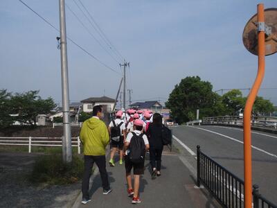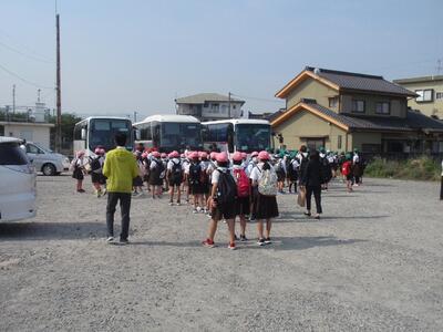 大きいバスは学校には入れないので、JA跡地の駐車場をお借りしています。そこまでは歩いて行きます。