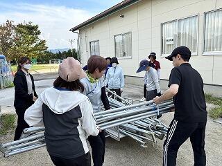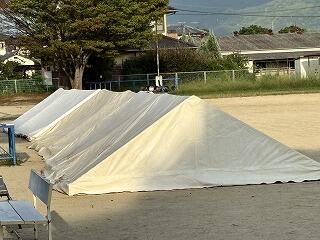 今日の放課後は職員が協力して本部テントを組み立てました。