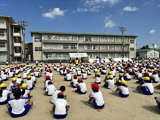 運動会全体練習一回目・学校教育奨励金給付式